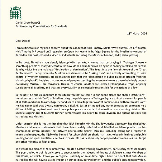 Nick Timothy decided to challenge the new Anti-Muslim-Hostility definition and called the event an act of dominance on X on the 17th. Cue the usual suspects (the same MPs who supported a ban on Maccabi Tel Aviv football fans) denouncing him as. They have sent a letter to the Parliamentary standards commissioner asking him to investigate Timothy. He told them to get lost. Starmer has called for him to be sacked. Kemi Badenoch refused and said that he was defending British values. This is Nick Timothy’s op-ed explaining his stance: https://www.telegraph.co.uk/news/2026/03/19/islamic-domination-of-public-sphere-is-unacceptable/ or https://archive.ph/t3CQn